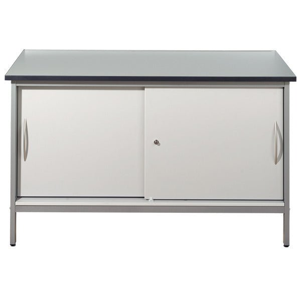 Lockable mailroom storage bench with shelf in beech or grey melamine finish.